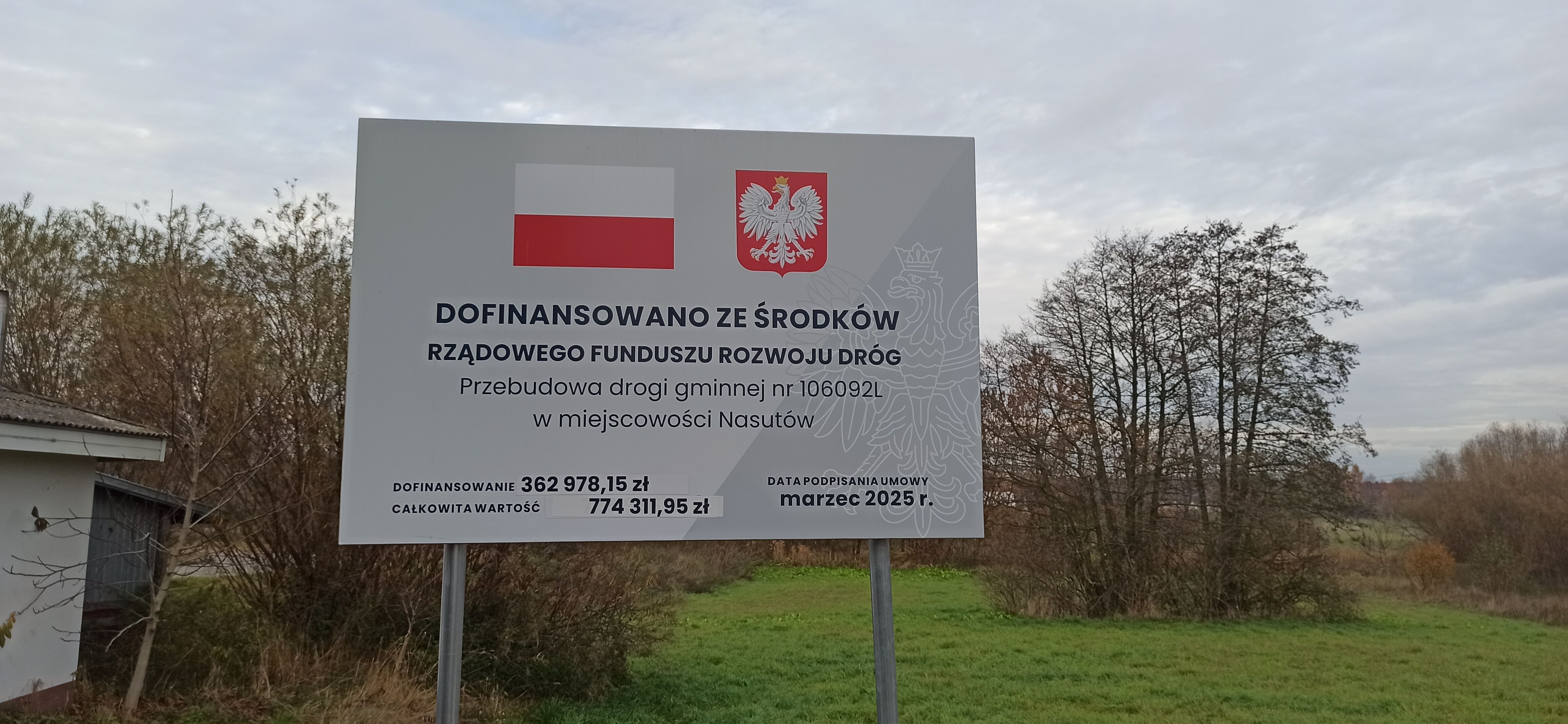 Gmina Niemce w ramach Rządowego Funduszu Rozwoju Dróg 2025 pozyskała dofinansowanie na realizację zadania pod nazwą „Przebudowa drogi gminnej nr 106092L w miejscowości Nasutów” w kwocie 362 978,16 zł.