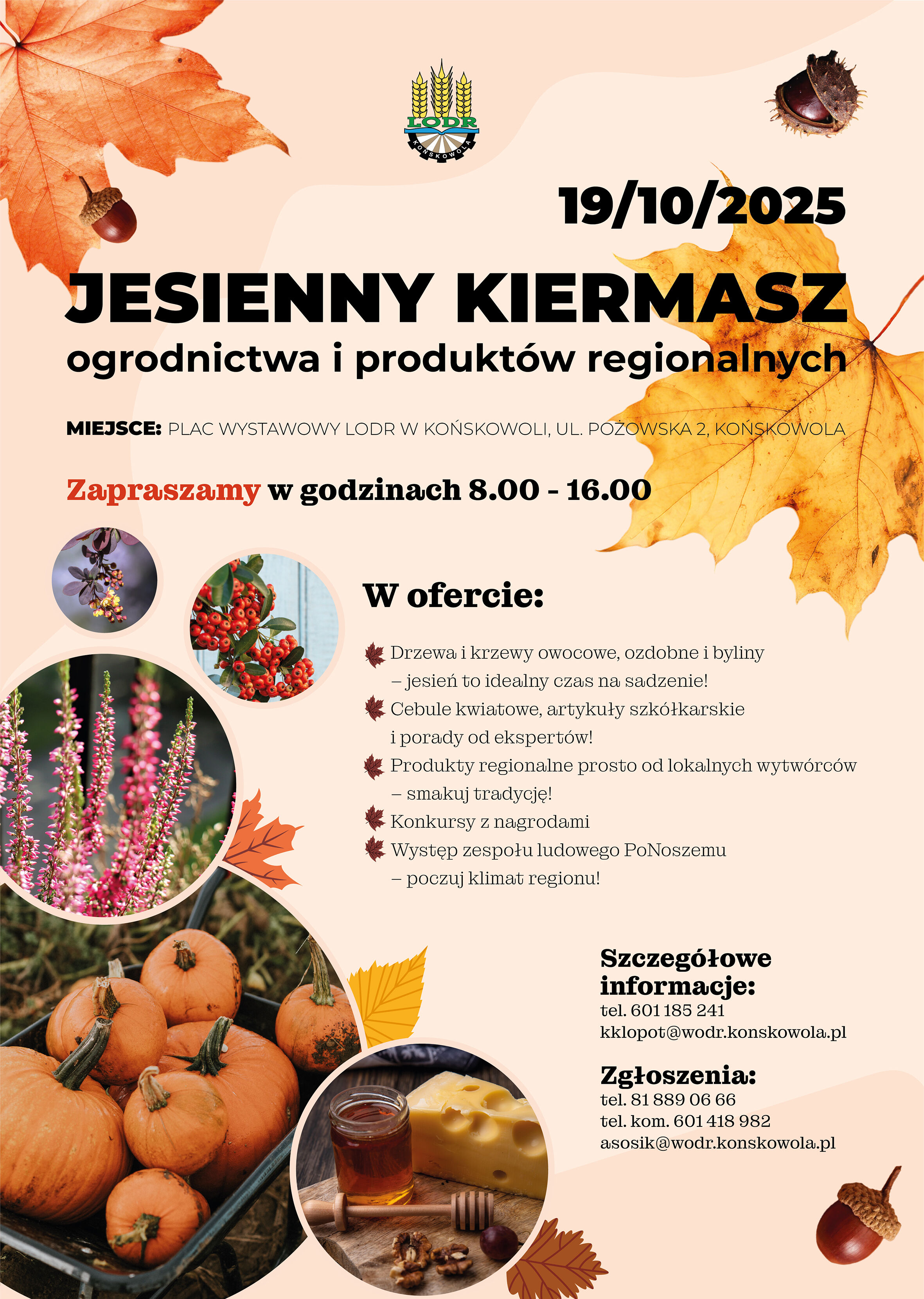 Lubelski Ośrodek Doradztwa Rolniczego w Końskowoli zaprasza na jesienny kiermasz ogrodnictwa i produktów regionalnych.