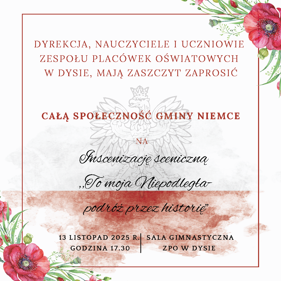 ,,To moja Niepodległa podróż przez historię" , która odbędzie się 13 listopada 2025 r. o godz. 17:30 w Sali Gimnastycznej ZPO w Dysie