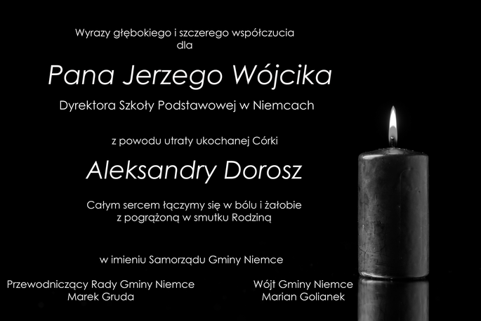 Wyrazy głębokiego i szczerego współczucia dla Pana Jerzego Wójcika, Dyrektora Szkoły Podstawowej w Niemcach z powodu utraty ukochanej Córki Aleksandry Dorosz, pracownicy Szkoły Podstawowej w Krasieninie.
